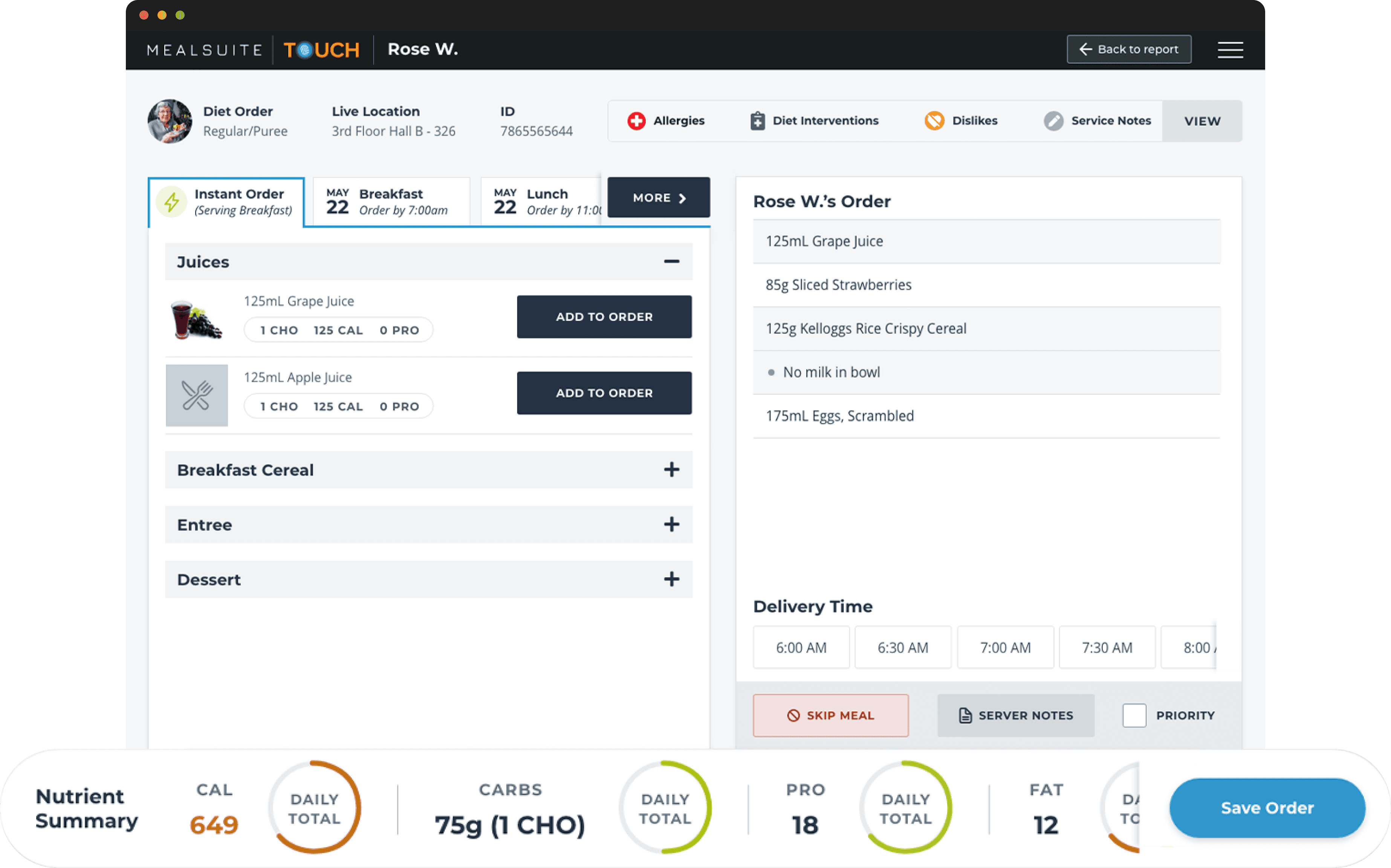 Developed intuitive tablet and bedside ordering flows (Instant Ordering Express & Advance Ordering) so staff could take orders from bedside or tableside, and sync orders directly to the kitchen in real time