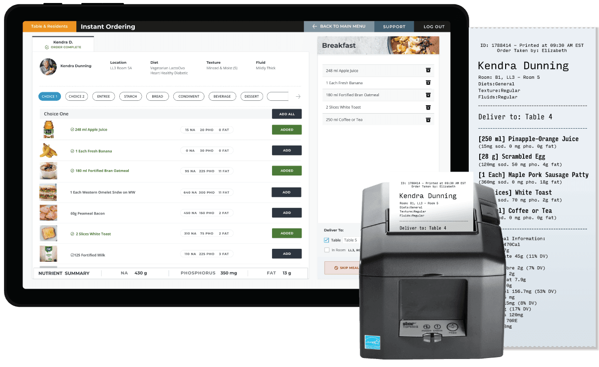 I designed modules to display scaled recipes, resident dietary profiles, and touch-screen kitchen workflows—enabling order accuracy and paperless operations for staff